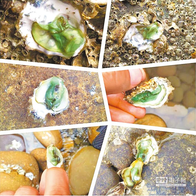由于污染嚴(yán)重,桃園海岸礁巖上的石蚵已轉(zhuǎn)墨綠色,不能食用。(圖片來(lái)自臺(tái)媒)
