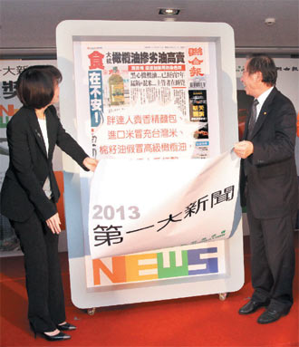 臺灣《聯合報》與張榮發基金會“票選2013第一大新聞”結果昨揭曉。張榮發基金會執行長聶國維(右)、聯合報總編輯游美月(左)公布第一大新聞為假油等食安新聞。圖片來源:臺灣《聯合報》