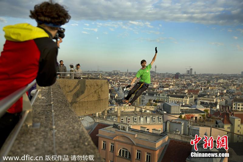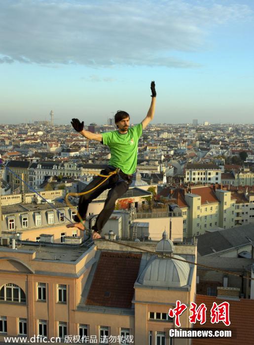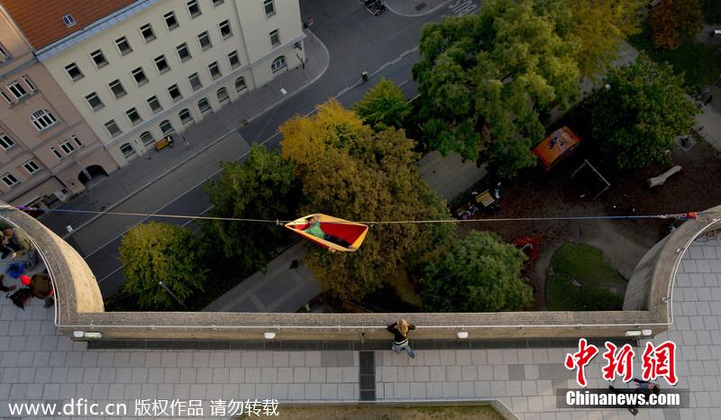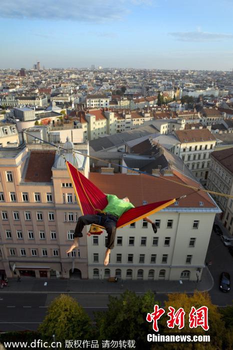 當?shù)貢r間2014年1月報道,睡吊床是一件十分愜意休閑的事情,不過這個距離地面100英尺的高空吊床卻只能用毛骨悚然來形容!冒險家Igor Scotland在奧地利維也納離地100英尺的空中拉起鋼絲繩掛起一張吊床,并在吊床中休息和睡覺,向自己的膽量極限發(fā)起挑戰(zhàn),吸引了大批市民駐足觀看,不少圍觀者都為他捏把汗。不過斯科蘭特本人卻悠然自得,不僅靜靜享受腳下的維也納風光,還不時在鋼絲繩上表演高超的技藝。圖片來源:東方IC 版權(quán)作品 請勿轉(zhuǎn)載
