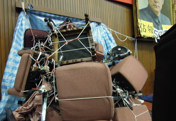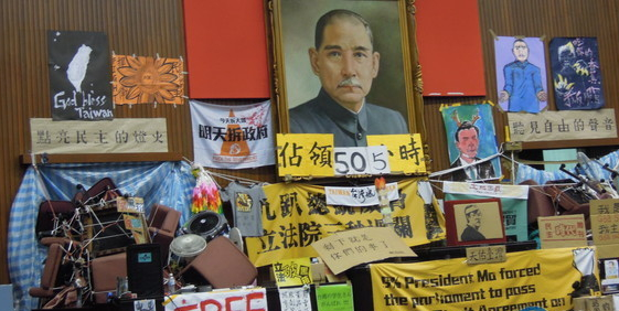 24天的占據議場行動,學生將議場改頭換面,用畫作、標語、道具等方式表達訴求及對政府的嘲諷,而7日學生宣告退出議場后,臺灣研究院社會學研究所副所長蕭阿勤等人率團隊保存學生創作,學生9日陸續開始打包整理,10日上午議場墻面露出原本的底色。(中國臺灣網 高旭)