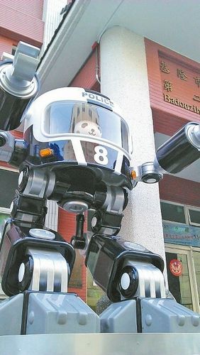 擺設(shè)在基隆警分局的大型警察公仔。來源:臺(tái)灣《聯(lián)合報(bào)》