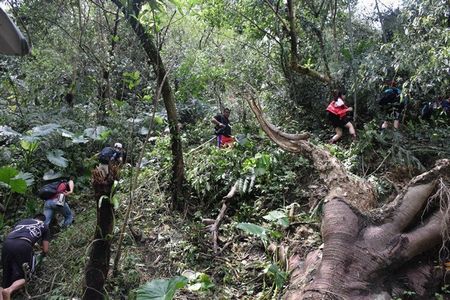 山區(qū)的路仍然濕滑,走在前方的人不時(shí)回頭叮嚀,“后面跟上了嗎?”“前面有點(diǎn)滑,拉旁邊的竹子底部”、“再五分鐘就到了”。發(fā)現(xiàn)后面的人跟不上,停下來等。