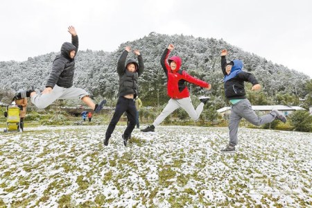 入冬最強(qiáng)寒流發(fā)威,讓許多不會(huì)下雪的地方都傳出雪訊。海拔僅470公尺高的宜蘭雙連埤24日清晨起降下瑞雪,民眾看見(jiàn)大地抹上一片雪白,興奮不已。(黃世麒攝)