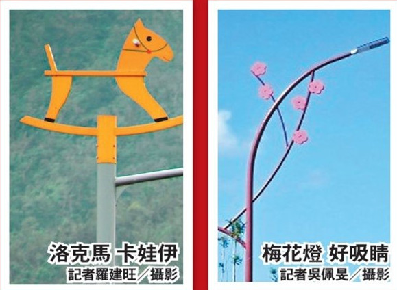 據(jù)臺灣《聯(lián)合報》報道,臺灣各縣市路燈造型多樣化,有些創(chuàng)意被贊賞,有些路燈則惹來負(fù)評。南方澳是鯖魚故鄉(xiāng),鯖魚意象路燈獲好評;冬山梅花湖風(fēng)景區(qū)梅花造型路燈也讓游客驚艷;“洛克馬”搖搖椅路燈已成三星鄉(xiāng)吉祥文創(chuàng)物。龍?zhí)懂a(chǎn)茶,結(jié)合石門水庫活魚,公所設(shè)計的“茶魚燈”也有助營銷地方特產(chǎn)。