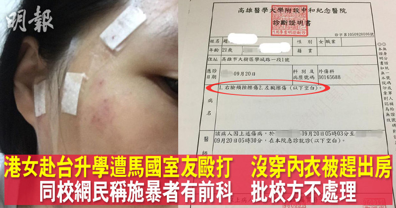 據香港《明報》9月22日報道,一名在臺灣高雄義守大學就讀的21歲趙姓香港少女,疑因不小心弄翻東西吵醒睡覺中的室友,被對方以水樽、掃把等毆打。少女驗傷后證實側臉流血,身上多處擦傷及瘀青。有同校網友表示,涉事室友是馬來西亞人,之前也有相關暴力紀錄,但校方否認,趙姓少女的臺灣籍男友擔心事件會被校方“壓下去”。