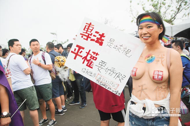 初中代課老師鄭敏上身全空,僅以“恐同違憲”貼紙,遮住胸前兩點,大膽造型吸引不少目光。她說,自己是雙性戀,男友叫她一定要參加游行力挺,僅貼住乳頭裝扮,是希望爭取女性上空權,強調“不論怎樣的身體,都是平等的”。