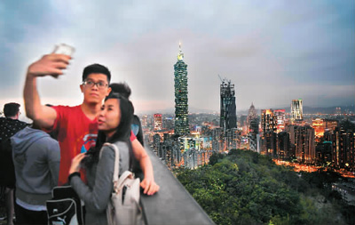 臺灣公布的最新數據顯示,大陸赴臺游客數量繼9月份同比下降近四成后,10月份擴大為同比下降44.3%。圖為游客在觀賞臺北夜景。