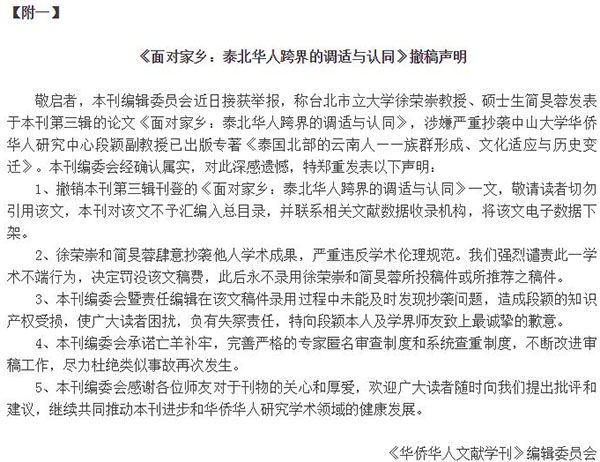 段穎說,在發(fā)現(xiàn)抄襲后,《華僑華人文獻(xiàn)學(xué)刊》編委會核對后,及時與他聯(lián)系,先行致歉,并商議撤稿事宜。