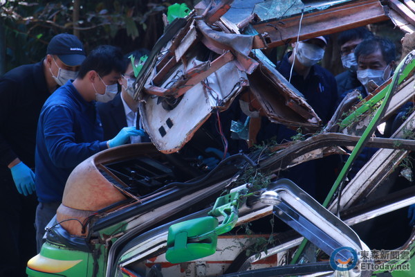 臺灣檢方勘驗事故車輛,懷疑司機疲勞駕駛釀禍。(圖片來源:臺灣“東森新聞云”)