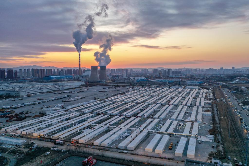 這是3月20日傍晚拍攝的吉林市高新南區隔離方艙建設現場(無人機照片)。新華社記者 張楠 攝