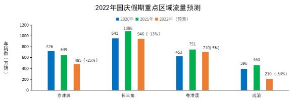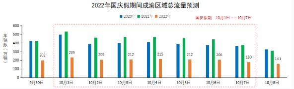 (四)成渝地區(qū)。目前,四川省疫情防控形勢(shì)總體可控,平穩(wěn)向好,尤其是成都市已取得階段性成果,但提倡就地過節(jié)以及較為嚴(yán)格的跨省跨市疫情管控措施將較大影響公眾出行意愿,出行需求相比中秋雖有所反彈,總體仍相對(duì)較低。預(yù)計(jì)成渝區(qū)域假期高速公路日均流量約為210萬輛,同比2021年(460萬輛)下降54%左右。其中,日均客車流量為173萬輛左右,日均貨車流量為37萬輛左右。國(guó)慶假期短途短期出游特征明顯,預(yù)計(jì)公眾跨省長(zhǎng)途旅游、探親等出行需求將進(jìn)一步降低;市內(nèi)出行需求將有所增長(zhǎng),以城市周邊短途短期的休閑游、親子游和健身游為主。