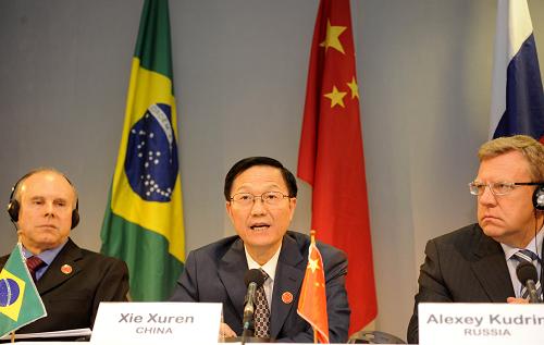 9月4日,在英國首都倫敦,中國財政部長謝旭人(中)在“金磚四國”財長和央行行長會議后舉行的新聞發(fā)布會上講話。當(dāng)日,中國、印度、巴西、俄羅斯“金磚四國”財長和央行行長會議在倫敦舉行。會議就當(dāng)前國際金融形勢、四國應(yīng)對危機(jī)的政策措施、第三次20國集團(tuán)領(lǐng)導(dǎo)人峰會議題及國際金融機(jī)構(gòu)改革等問題進(jìn)行了討論并達(dá)成廣泛共識。 新華社記者曾毅攝