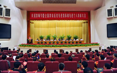 9月9日,在第25個教師節到來之際,慶祝教師節暨全國教育系統先進集體和先進個人表彰大會在北京舉行。這是大會會場(9月9日攝)。新華社記者 李濤 攝