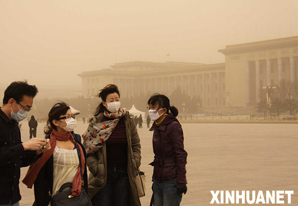 3月22日,幾位游客在北京天安門(mén)廣場(chǎng)游覽。當(dāng)日上午,沙塵再襲北京。中央氣象臺(tái)于6時(shí)發(fā)布沙塵暴藍(lán)色預(yù)警。新華社發(fā)(桑全利攝)