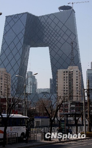 圖為2009年3月28日,北京,中央電視臺新臺址。此前2月9日晚,cctv新臺址文化中心因燃放煙花爆竹發生特大火災安全事故,造成直接損失達1.6億余元。 中新社發 胡予芳 攝
