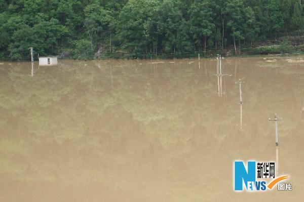 5月18日,貴州省德江縣穩(wěn)坪鎮(zhèn)海溪溝,大水快要將電線桿淹沒。新華社發(fā)