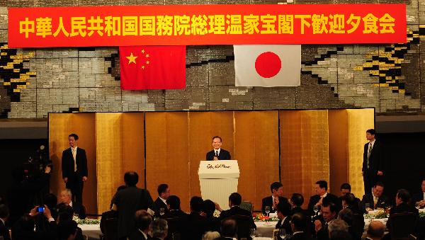 5月30日晚,中國國務院總理溫家寶在東京出席日中友好七團體和僑界四團體聯合舉行的晚宴并講話。 新華社記者 季春鵬 攝