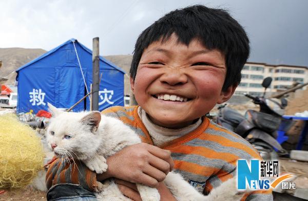 2010年5月31日 難以忘卻 玉樹的微笑小天使 9歲的藏族男孩歐亞才瓦抱著他在地震后救護(hù)的流浪貓坐在自家的帳篷前(4月18日攝)。青海玉樹災(zāi)區(qū)那些天真可愛的孩童,還有他們天使般的微笑永難忘卻。在地震廢墟上,孩子們的微笑孕育著生機(jī)和希望:擦干眼淚,挺起脊梁,生活仍在繼續(xù)。新華社記者 侯德強(qiáng) 攝