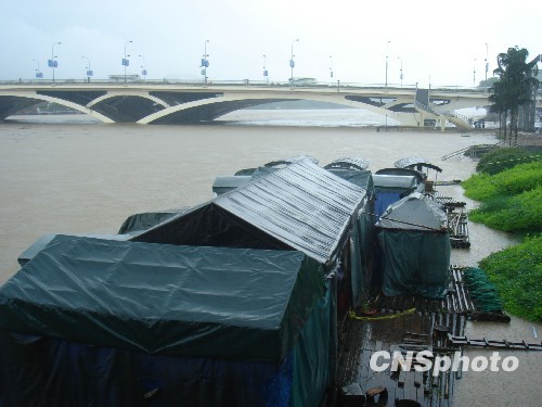 6月17日8時20分,桂林市氣象局發布暴雨紅色預警信號:桂林市區預計3小時雨量將達100毫米以上,且降雨可能持續。10時39分,桂林市區段漓江水位達到146米,超過警戒水位0.3米,預計下午16時,漓江水位將達到147.2米。圖為停靠在桂林市解放橋下的魚船。 中新社發 歐惠蘭 攝