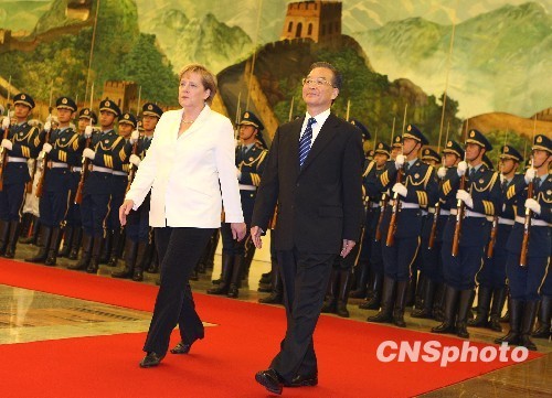 7月16日上午,中國國務院總理溫家寶在北京人民大會堂舉行儀式歡迎德國總理默克爾訪華。 中新社發 任晨鳴 攝