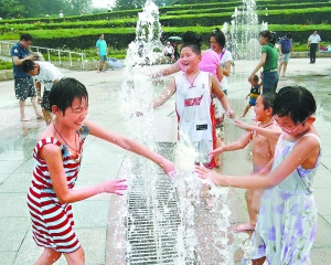 18日,在北京植物園噴泉廣場,孩子們在盡情戲水,享受夏日里的清涼。李繼輝攝(圖片來源:北京日報)
