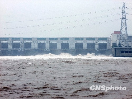 上午9時許,記者在三峽壩頂看到,9個深孔泄洪,巨大的白色水柱如虹如龍,在壩頂能感覺到水的強大沖擊力,泄洪閘前霧氣騰騰,洪水如脫韁野馬,飛瀉而出,發出如雷鳴般的巨響,翻起的滾滾白浪洶涌的拍打著壩下的江堤,在三峽大壩左右岸電站廠房內26臺發電機組全部開啟運轉,電能源源不斷送往中國各地。