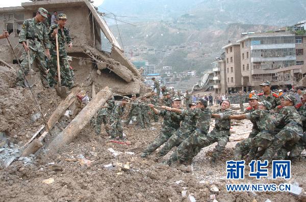 8月9日,武警官兵正試圖用繩子將淤泥中的木樁拉出。新華社記者 高健鈞 攝