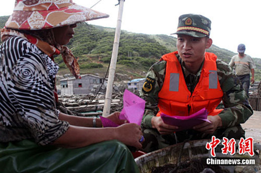 9月8日,福建省平潭縣蘇澳邊防派出所組織民警深入轄區(qū)幫助群眾解決困難,全力應(yīng)對今年第10號熱帶風(fēng)暴的襲來。圖為邊防官兵深入轄區(qū)碼頭、漁排向在海上生產(chǎn)作業(yè)的漁民和海上養(yǎng)殖戶發(fā)布防臺預(yù)警信息。中新社發(fā) 黃煜情 攝