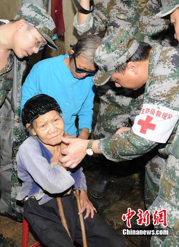 部隊醫(yī)護人員為受災群眾診治病情。 朱文 攝
