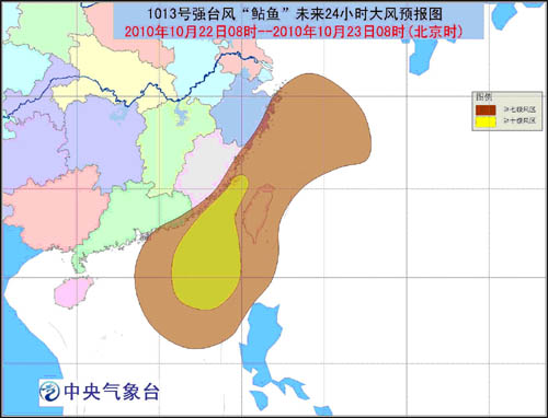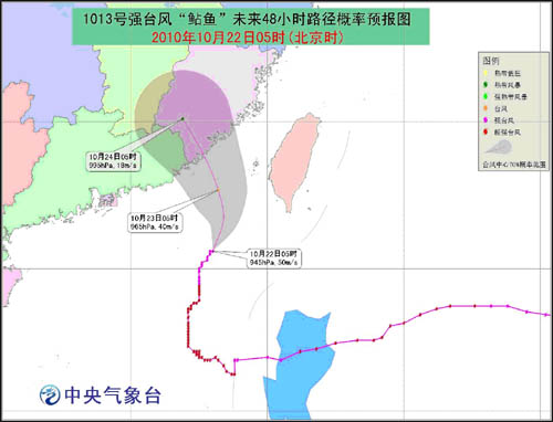 今年第13號強(qiáng)臺風(fēng)“鲇魚”的中心10月22日05時位于廣東省和福建省交界處南偏東約340公里的南海北部海面上,就是北緯20.6度,東經(jīng)118.0度,中心附近最大風(fēng)力有15級(50米/秒),最低氣壓為945百帕。