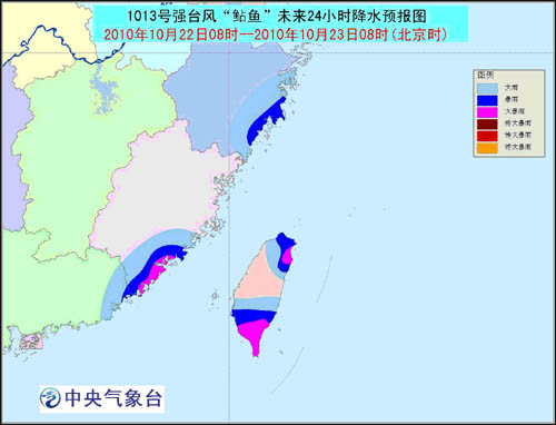 受“鲇魚”和冷空氣的共同影響,22日08時至23日08時,東海大部海面、臺灣以東洋面、巴士海峽、巴林塘海峽、南海中部偏東海面將有7-8級大風(fēng),陣風(fēng)9-10級,臺灣海峽、臺灣、福建、廣東東部、浙江等地沿海的風(fēng)力將有9-10級,陣風(fēng)可達(dá)11-12級;南海東北部的風(fēng)力有10-13級,陣風(fēng)可達(dá)14-15級;“鲇魚”中心經(jīng)過的附近海面風(fēng)力可達(dá)13-15級,陣風(fēng)可達(dá)16級及以上;浙江東南部沿海、福建東南部、臺灣等地有大到暴雨,局地有大暴雨。