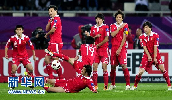 1月12日,中國隊球員防守對方任意球。當日,在多哈舉行的亞洲杯足球賽A組比賽中,中國隊0:2不敵東道主卡塔爾隊。 新華社記者陶希夷攝