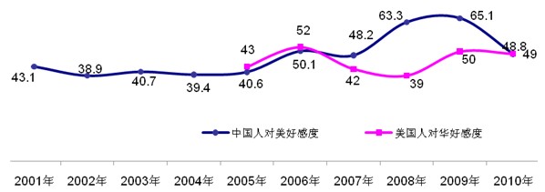 數(shù)據(jù)來源:中國人對美國好感度2001-2009年數(shù)據(jù)來自零點研究咨詢集團“中國人眼中的世界”系列調(diào)查;2010年數(shù)據(jù)來自《中國日報》與零點研究咨詢集團首次聯(lián)合進行的“中國人眼中的美國”調(diào)查;美國人對中國好感度數(shù)據(jù)來自2005-2010年P(guān)ew Research公布的報告。