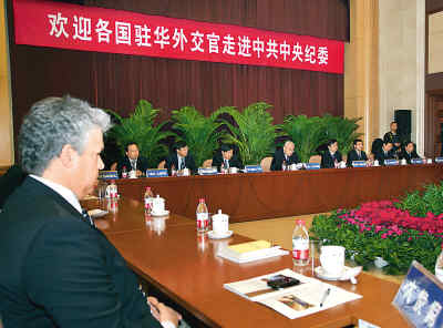 中紀委官員向駐華外交官介紹中紀委職能部門工作情況。記者 趙永琦攝