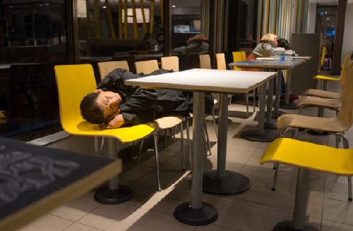 盡管其他餐廳會把流浪者趕出去,但麥當勞基本上對丁新風這樣的流浪人員持接納態度。自麥當勞在亞洲地區推出更多24小時門店之后,流浪人員紛紛云集。麥當勞在中國內地的2200家餐廳有一多半都是24小時營業。