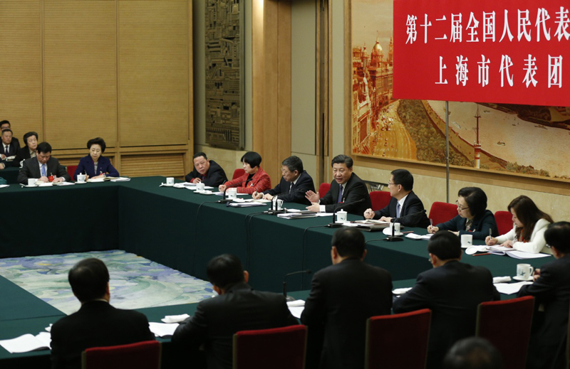 圖為:2016年3月5日,習近平參加十二屆全國人大四次會議上海代表團的審議。