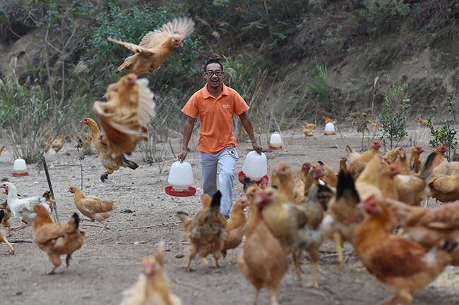 安徽岳西農村淘寶合伙人楊凱林路過村民的雞場時幫著送水(照片由本人提供)
