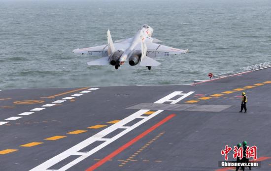 資料圖:中國海軍遼寧艦在渤海某海域進(jìn)行艦機(jī)融合訓(xùn)練,新一批殲-15艦載戰(zhàn)斗機(jī)飛行員駕機(jī)完成觸艦復(fù)飛、阻攔著艦等多個(gè)課目訓(xùn)練。 中新社發(fā) 李唐 攝