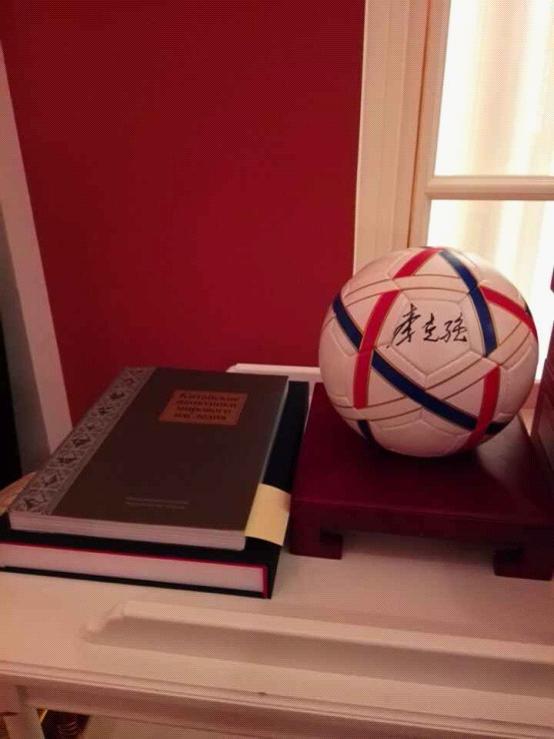 李克強知道梅德韋杰夫喜歡踢球和攝影,他專門準備了一份禮物:俄羅斯國旗白藍紅三色相間的簽名足球,還有一本俄文版的《中國世界遺產畫冊》。