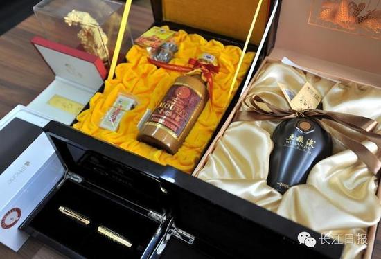 比較引人注目就是酒類,有紅酒、洋酒和白酒,記者看到現場有6瓶茅臺酒和6瓶五糧液,茅臺年份有50年和15年的,有的市場價為3萬多元一瓶,起拍價為9480元/瓶,五糧液每瓶起拍價為3770元。另外有一支派克鋼筆也比較引人注目,標簽上價格為11800元,起拍價為4600元。