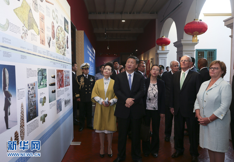 11月21日,國(guó)家主席習(xí)近平和夫人彭麗媛在利馬同秘魯總統(tǒng)庫(kù)琴斯基和夫人蘭格共同出席中拉文化交流年閉幕式并參觀“天涯若比鄰-華夏瑰寶展”。新華社記者 蘭紅光 攝