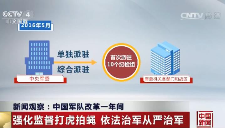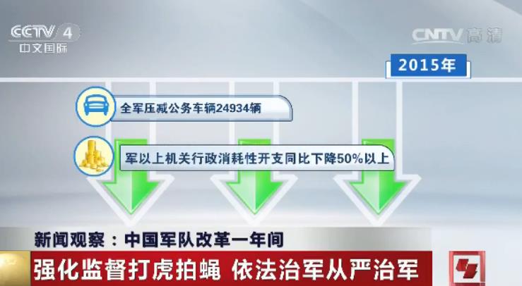 強化監督依法治軍從嚴治軍的強軍之基進一步夯實。2015年全軍壓減公務車輛24934輛,軍以上機關行政消耗性開支同比下降50%以上。2016年5月中央軍委采取單獨派駐和綜合派駐的方式,首次向軍委機關各部門和戰區派駐10個紀檢組。