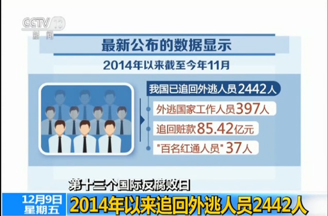 中央反腐敗協調小組國際追逃追贓工作辦公室最新公布的數據顯示,2014年以來,截至今年11月,我國已追回外逃人員2442人,其中外逃國家工作人員397人,追回贓款85.42億元,“百名紅通人員“37人。
