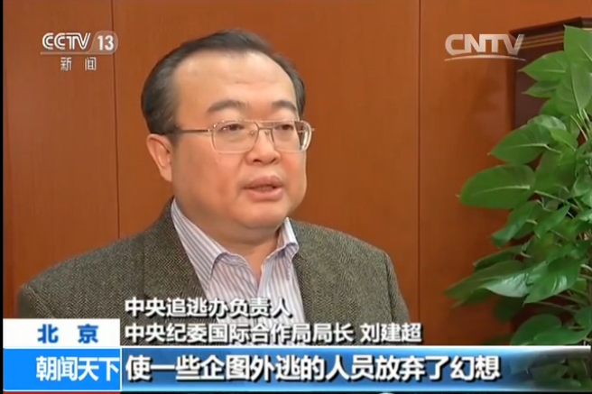 中央追逃辦負責人、中央紀委國際合作局局長 劉建超:我們形成了全球追逃追贓的態勢之后,這些人舉得自己的壓力大了,不管坐的什么車,不管住在什么房子里,他們是惶惶不可終日,覺得我有一天會被追回去,我是被追逃者,所以我想再次告誡他們,追逃者的腳步確實離他們越來越近。