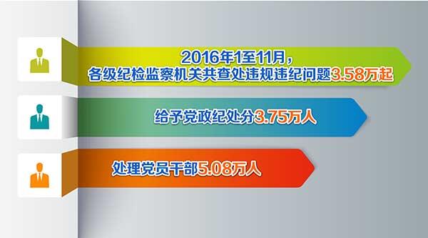 “在堅(jiān)持中深化、在深化中堅(jiān)持,讓中央八項(xiàng)規(guī)定精神落地生根。”根據(jù)年初中央紀(jì)委六次全會(huì)部署,2016年,各級(jí)紀(jì)檢監(jiān)察機(jī)關(guān)聚焦監(jiān)督執(zhí)紀(jì)問責(zé),不斷堅(jiān)持深化,對(duì)于不收手不知止、繼續(xù)頂風(fēng)違紀(jì)的,發(fā)現(xiàn)一起查處一起,一批違反中央八項(xiàng)規(guī)定精神典型問題被查處。2016年1至11月,各級(jí)紀(jì)檢監(jiān)察機(jī)關(guān)共查處違規(guī)違紀(jì)問題3.58萬起,處理黨員干部5.08萬人,給予黨政紀(jì)處分3.75萬人。