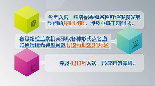 年初,中央紀(jì)委提出明確要求,對(duì)2016年1月1日以后發(fā)生的違反中央八項(xiàng)規(guī)定精神受到黨紀(jì)政紀(jì)處分人員,原則上都要點(diǎn)名道姓通報(bào)曝光。今年以來,中央紀(jì)委點(diǎn)名道姓通報(bào)曝光典型問題8批44起,涉及中管干部11人。各級(jí)紀(jì)檢監(jiān)察機(jī)關(guān)采取各種形式點(diǎn)名道姓通報(bào)曝光典型問題1.12萬批2.91萬起,涉及4.31萬人次,形成有力震懾。