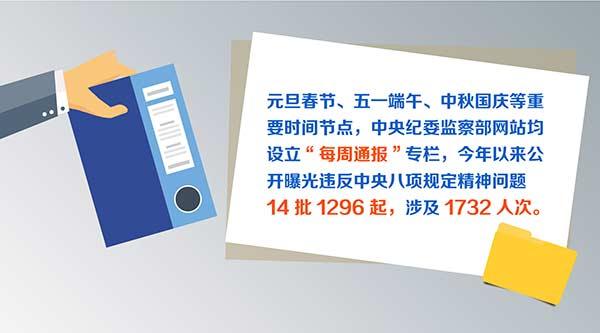 中央紀(jì)委堅(jiān)持月報(bào)制度,每月定期公布《全國查處違反中央八項(xiàng)規(guī)定精神問題匯總表》。元旦春節(jié)、五一端午、中秋國慶等重要時(shí)間節(jié)點(diǎn),中央紀(jì)委監(jiān)察部網(wǎng)站均設(shè)立“每周通報(bào)”專欄,今年以來公開曝光違反中央八項(xiàng)規(guī)定精神問題14批1296起,涉及1732人次。
