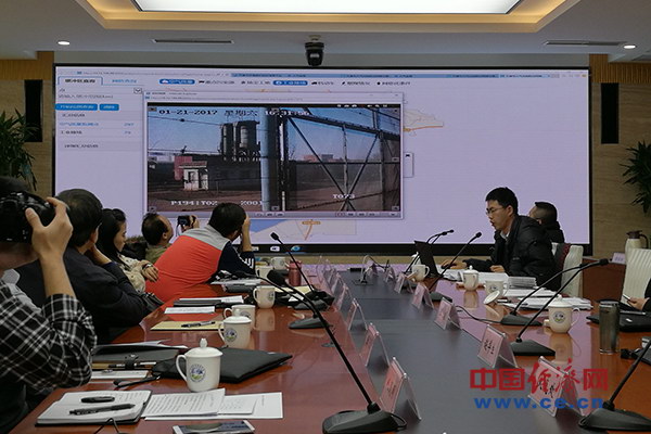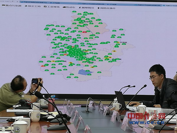 天津市環(huán)保局工作人員向采訪團展示重點監(jiān)測對象的實時監(jiān)測情況。(中國經(jīng)濟網(wǎng)記者范戴芫 攝)