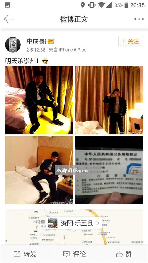6日,該微博已被發(fā)布者“中成哥i”刪除。但根據(jù)報(bào)料者截圖,“明天殺崇州!”的微博發(fā)布于2月5日12時(shí)38分,微博發(fā)布時(shí)的定位為資陽市樂至縣公園路附近。4張配圖中,有3張同一小伙在賓館內(nèi)持槍的圖片,另有1張圖片為“中華人民共和國公務(wù)用槍槍證”,上面能清晰地看出證號(hào)、槍號(hào)、配備單位、槍型和發(fā)證機(jī)關(guān)。“中華人民共和國公務(wù)用槍槍證”顯示,槍支配備單位為資陽地區(qū)樂至縣公安局,槍型為六四式手槍,發(fā)證機(jī)關(guān)為四川省公安廳。