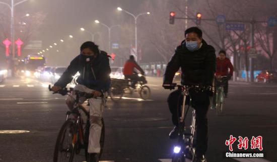 資料圖:1月3日,北京持續(xù)重度霧霾天氣,民眾戴口罩騎行在街頭。中新社記者 楊可佳 攝